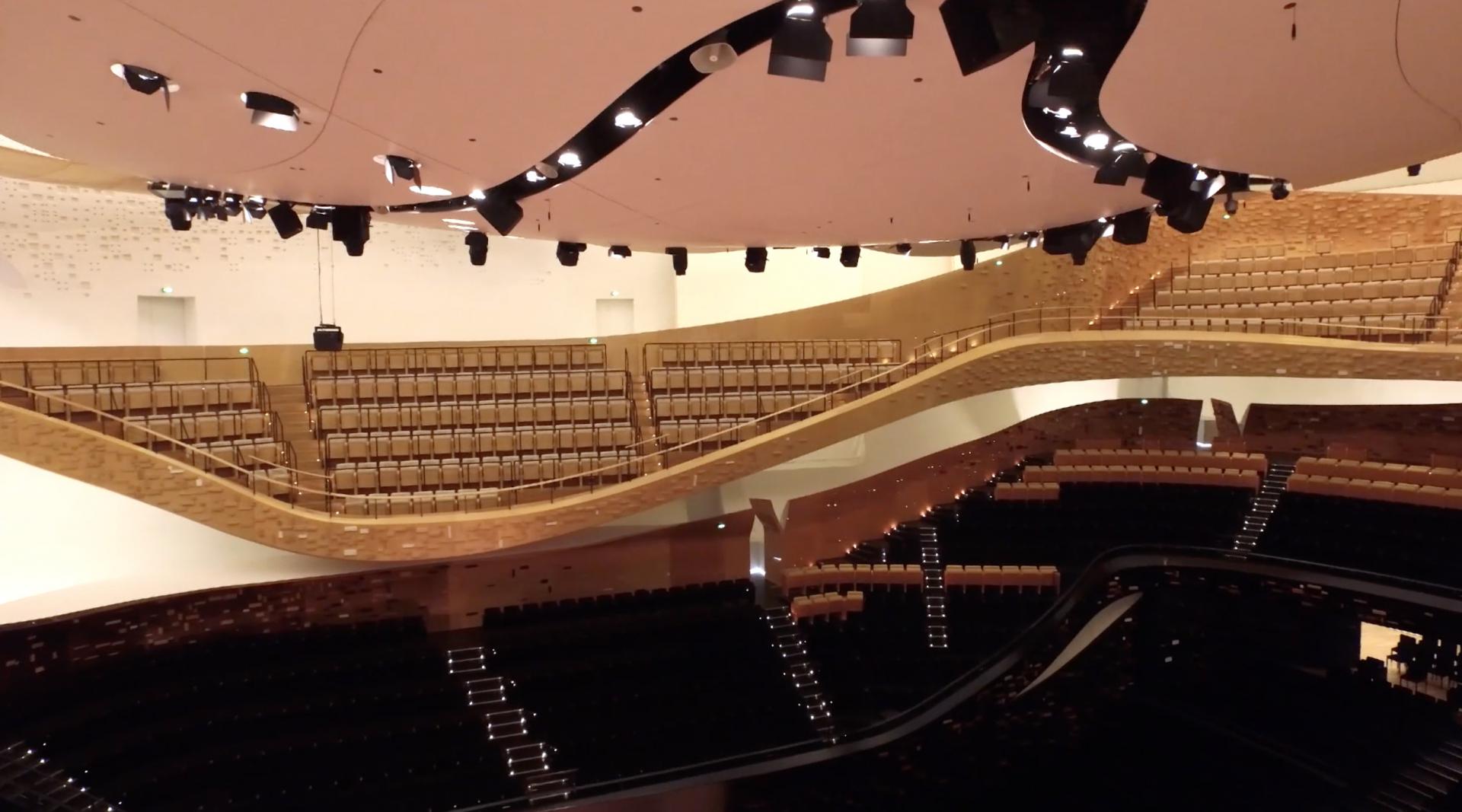 The Grande salle Pierre Boulez (Symphonic Hall) boasts innovations in architecture, stage design and acoustical engineering. Thanks to a modular design, its capacity increases from 2400 people in the symphonic configuration to 3600 when the parterre is converted into a standing room area.